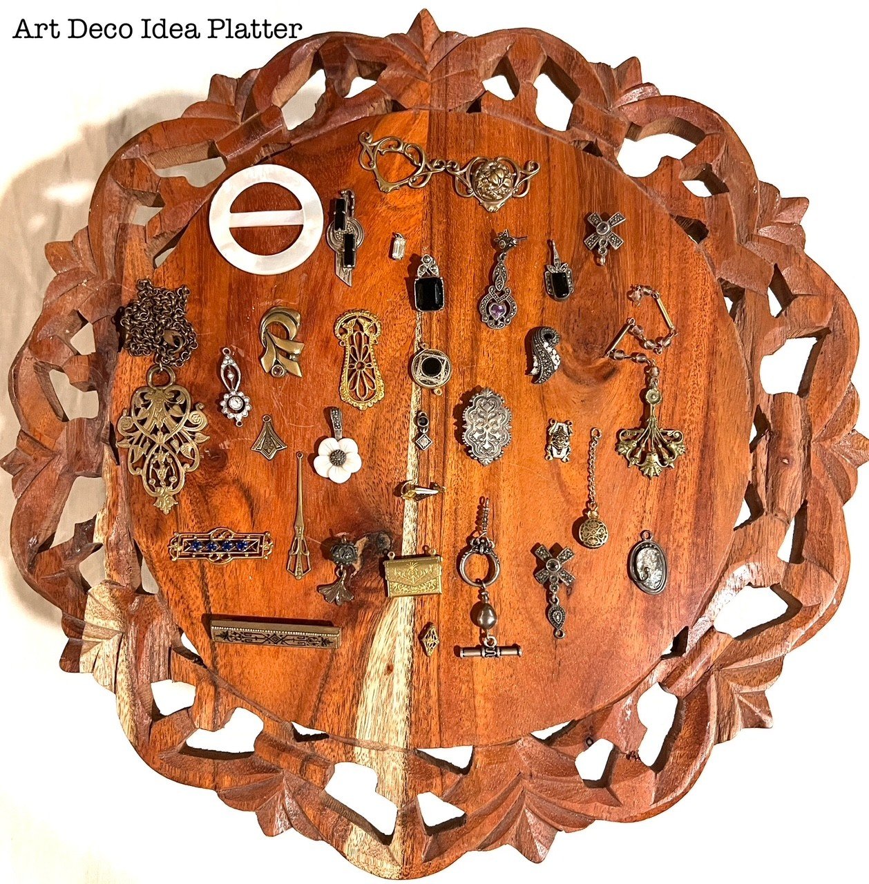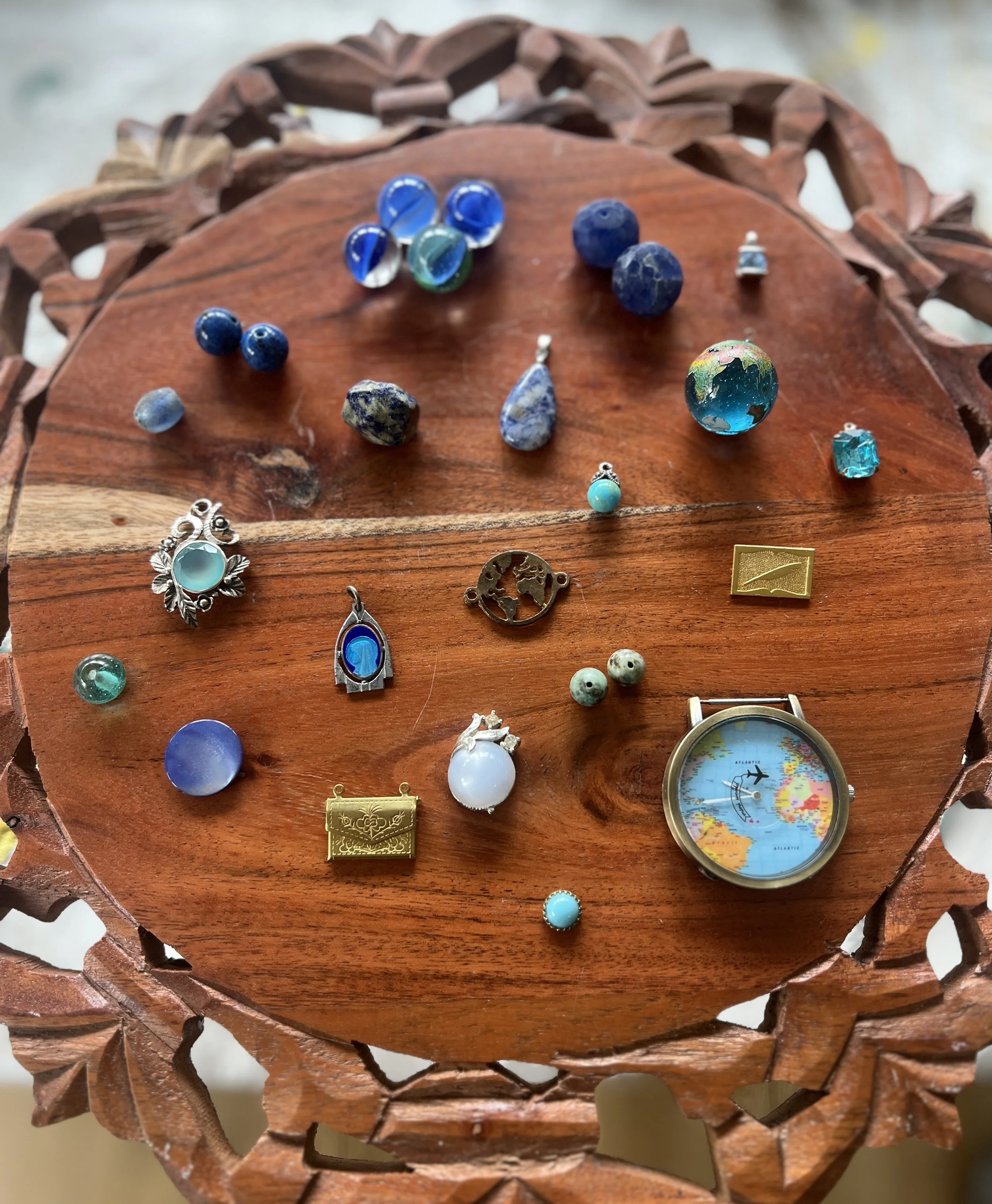I thought about the elements heather wanted to convey through her gift of personalized jewelry, and began looking through my collection of beads and objects in my studio. I also sourced from a variety of delightful places to compose what I call an “Idea Platter,” which I shared with heather to see what she responded to.